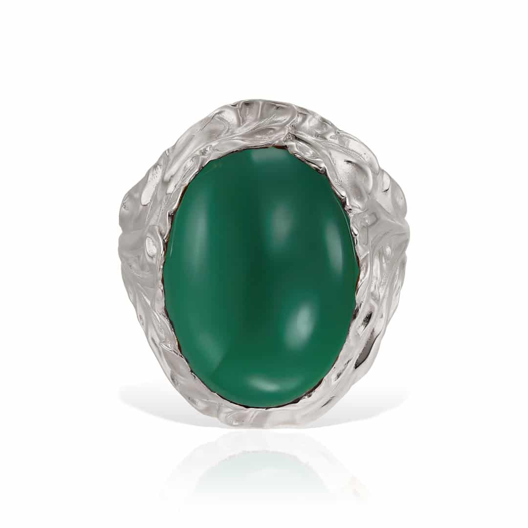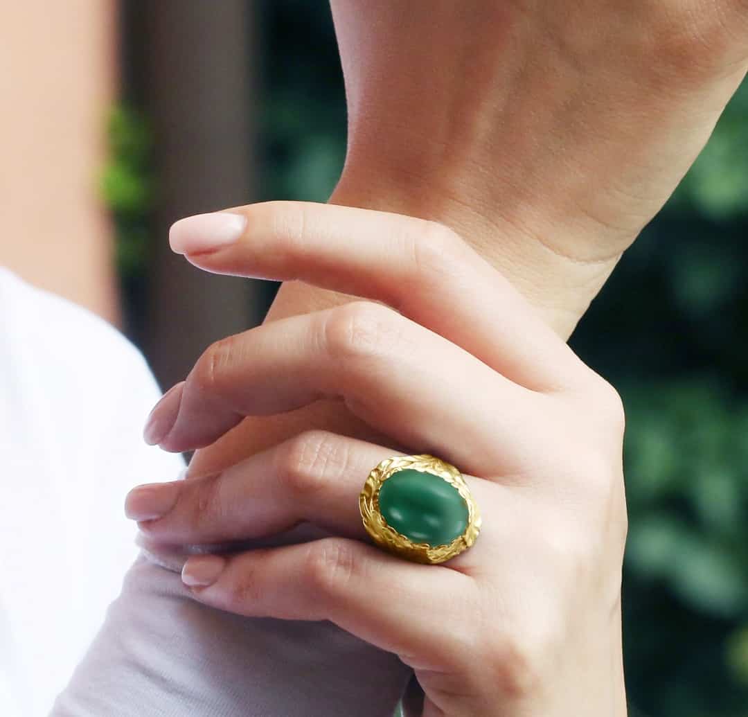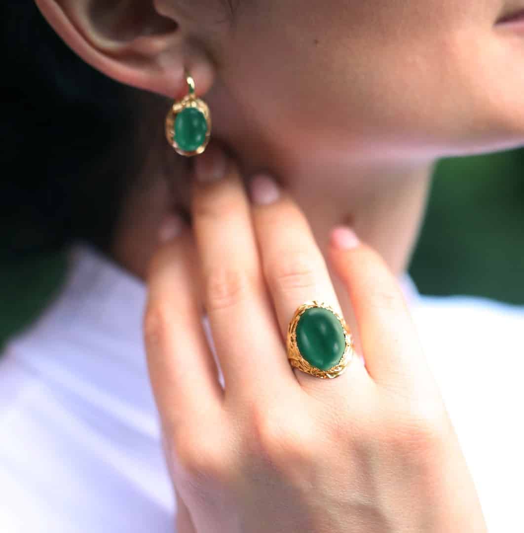 Inelul din aur de 14 kt cu agat verde este destinat unei doamne sau domnișoare cu gusturi delicate, care apreciază liniile fine ale unei bijuterii autentice.